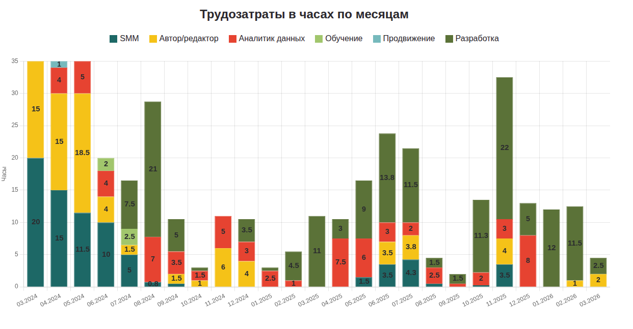 Классическая проблема — хронический дефицит времени — в этот раз наложилась на другие факторы. За последние годы я заметил чёткий цикл своей продуктивности длиной около 6 месяцев: разгон, пик, инерция и торможение. Март как раз пришёлся на фазу торможения. Это видно даже на графике: